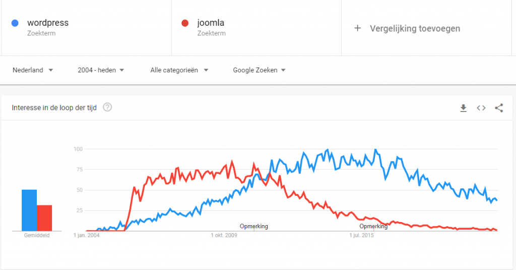 In onderstaande vergelijking in Google Trends zie je dat Joomla in het begin populairder was maar WordPress precies rond de tijd dat ik mijn eerste WordPress website maakte Joomla voorbij streef wat betreft interesse.