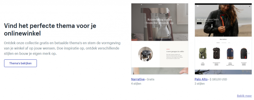 Het design van je Shopify webwinkel wordt bepaald door het thema. Er zijn meerdere gratis thema’s waar je uit kan kiezen en daarnaast zijn er ook betaalde thema’s. Deze kosten vaak zo’n $180. Verder kan je functionaliteiten aan je website toevoegen met gratis en betaalde apps.