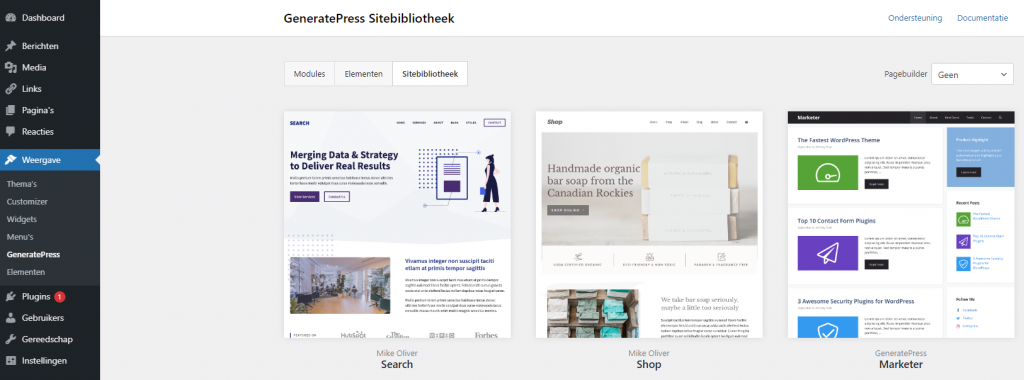 Op de website van GeneratePress vind je een Site Library. Hier zie je allemaal voorbeelden van wat je kan maken met dit thema.