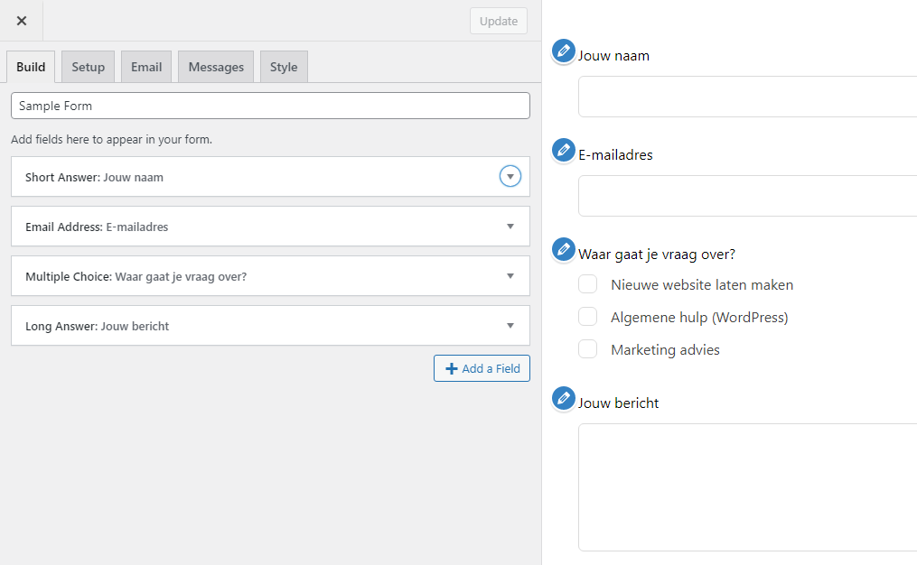 Het maken van het contactformulier werkt het zelfde als de WordPress Customizer die je al gewend bent als je met WordPress werkt. Je hoeft dus niet te zoeken naar instellingen.