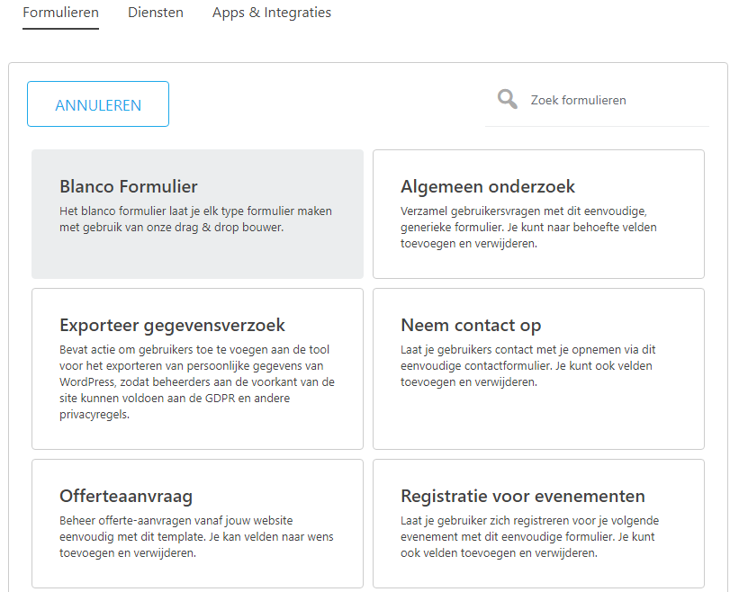 Je kan kiezen uit een leeg formulier en zelf de velden invoeren of uit een van de vele templates.