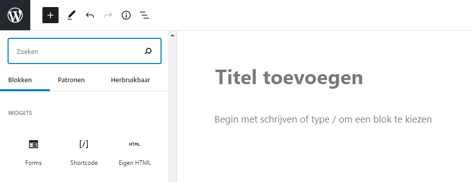 Door in een pagina op het plus-teken te klikken kan je een blok toevoegen. Hoogst waarschijnlijk staat het ‘form blok’ onder widgets.
