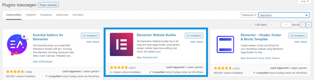 Je kan Elementor installeren door in je dashboard naar plugins > nieuwe plugin te gaan en vervolgens te zoeken op ‘elementor’.