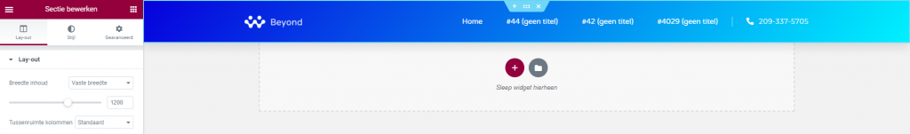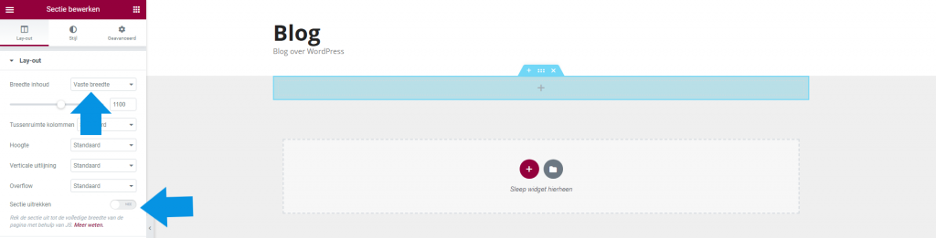 Om de header zo breed als de pagina te maken kies ik bij lay-out voor ‘volledige breedte’ en ‘sectie uitrekken’.