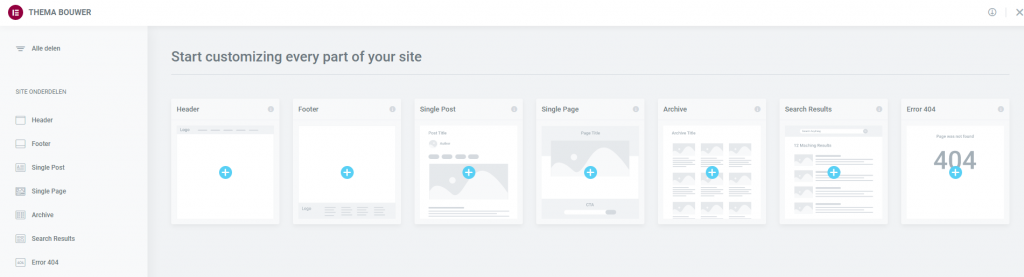Met de themebuilder kan je echter ook je header en footer aanpassen, het lay-out van WooCommerce pagina’s, blog templates, archief pagina’s, etc.