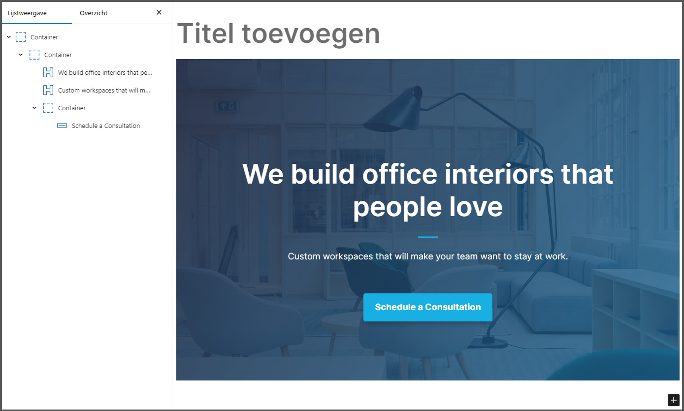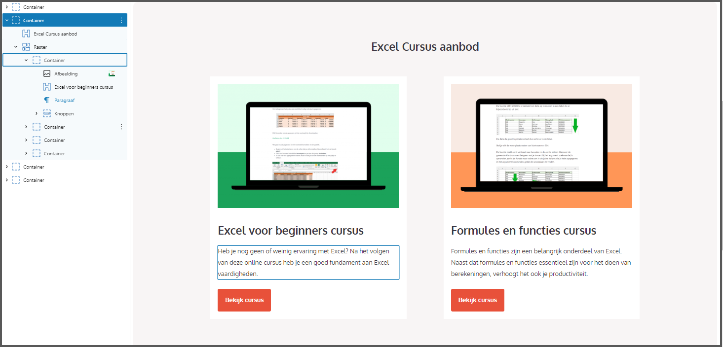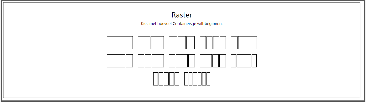 Een container kun je zien als een sectie van de pagina waarin je andere blokken kunt plaatsen. Door rijen en/of kolommen aan een container toe te voegen kun je vervolgens content structuur geven.