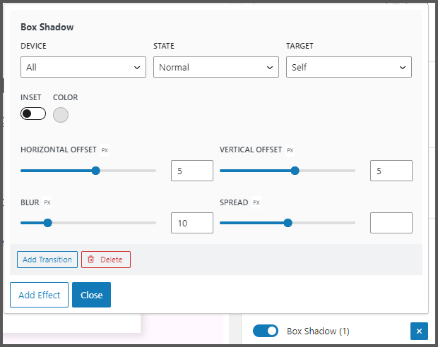 Je krijgt de mogelijkheid om effecten toe te voegen aan containers, kopregels en knoppen.