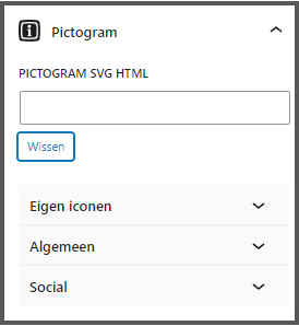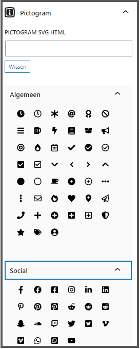 Normaal gesproken wanneer je een pictogram wilt toevoegen aan een kopregel, dan heb je de keuze uit een aantal standaard pictogrammen in de groepen ‘Algemeen’ en ‘Sociaal’. Je kunt je eigen SVG pictogram gebruiken door de SVG HTML kopiëren en plakken.