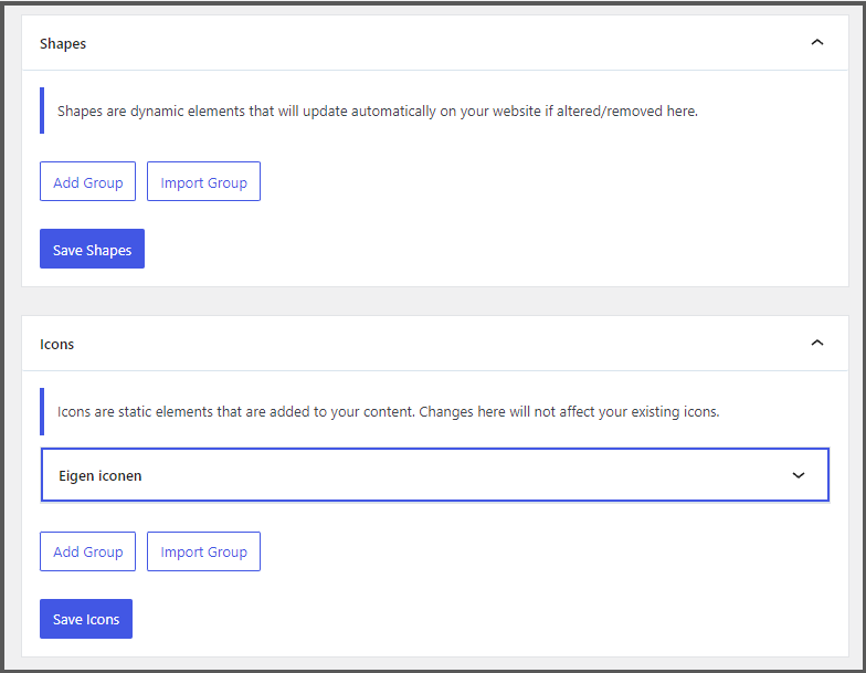 Op deze manier heb je dus snel toegang tot je eigen pictogrammen. Het is bovendien ook mogelijk om groepen met vormen en/of pictogrammen te exporteren en importeren, zodat je het op meerdere van je websites kunt gebruiken.