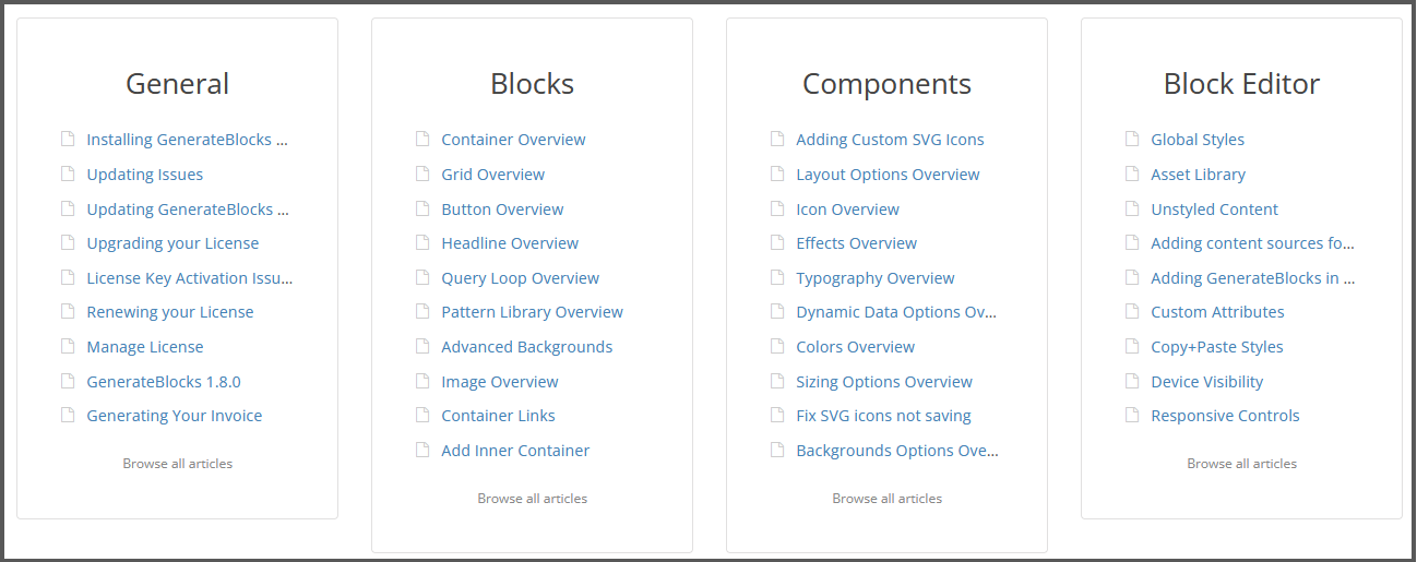 GenerateBlocks heeft op zijn website een uitgebreide documentatie waarin de werking van de plugin gedetailleerd wordt uitgelegd.