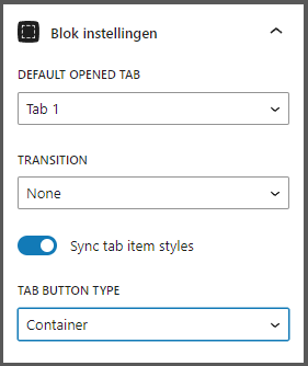 Het blok met Tabs werkt soort gelijk als het Accordion blok, alleen presenteer je hierbij je content in meerdere tabbladen.