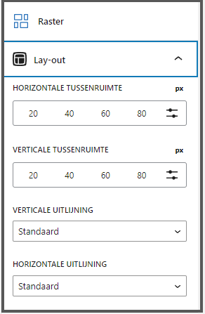 Bij het invoegen van het Raster blok heb je al gekozen uit hoeveel kolommen het lay-out moet komen te bestaan. Bij de Lay-out instellingen kun je vervolgens instellen wat de horizontale- en verticale tussenruimte tussen de kolommen en/of rijen moet zijn en de uitlijning.