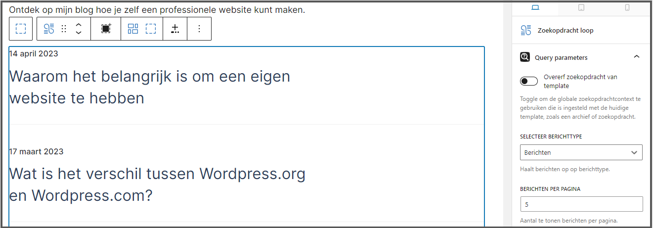 De berichtitel en Berichtdatum zijn gemaakt met het blok Kopregel. Deze kun je dus vervolgens zo opmaken als je zelf wilt. Verder kun je in de Zoekopdracht loop instellingen bepalen hoeveel berichten er moeten worden getoond.