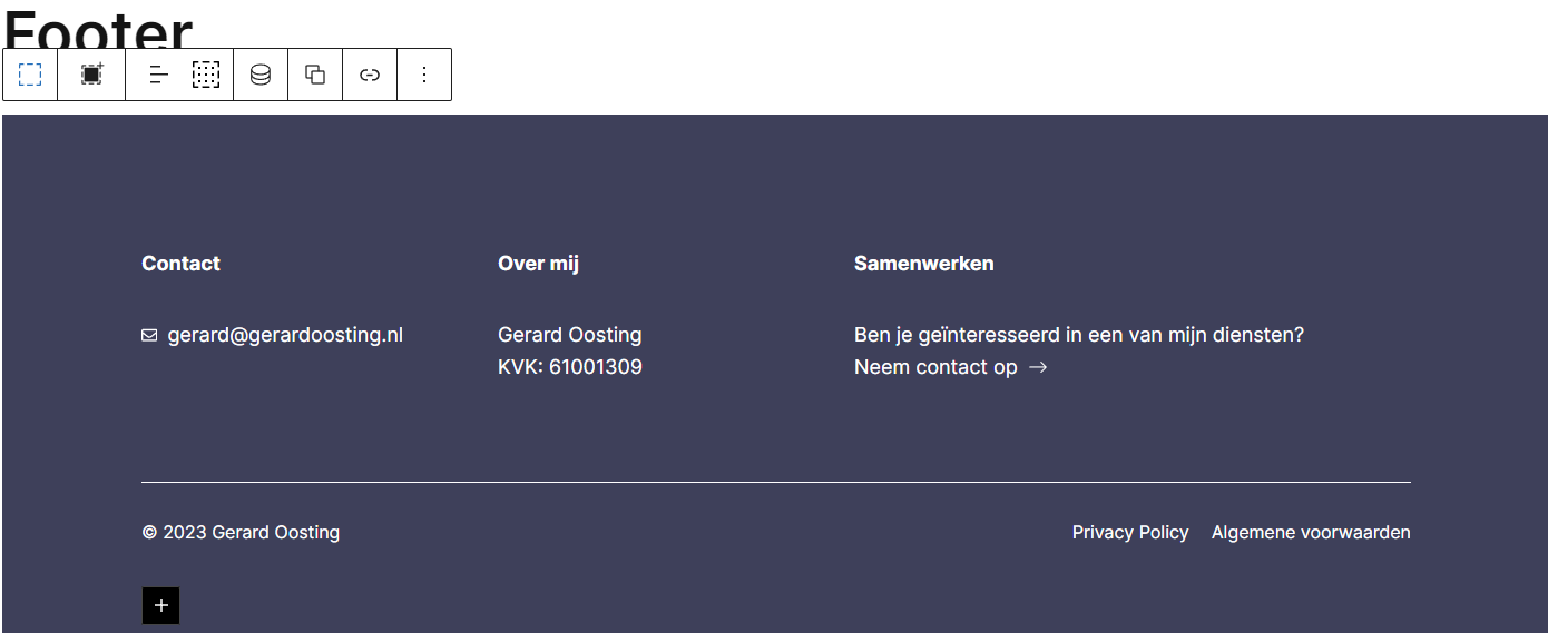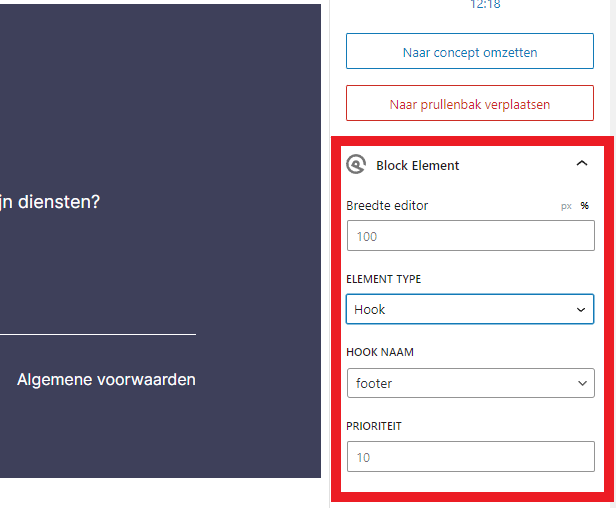 Het element type ‘sitefooter’ is het gedeelte waar de copyright staat. De footer die ik in de blokeditor heb gemaakt moet de gehele footer vervangen. Het juiste element type is in dit voorbeeld ‘Hook’.