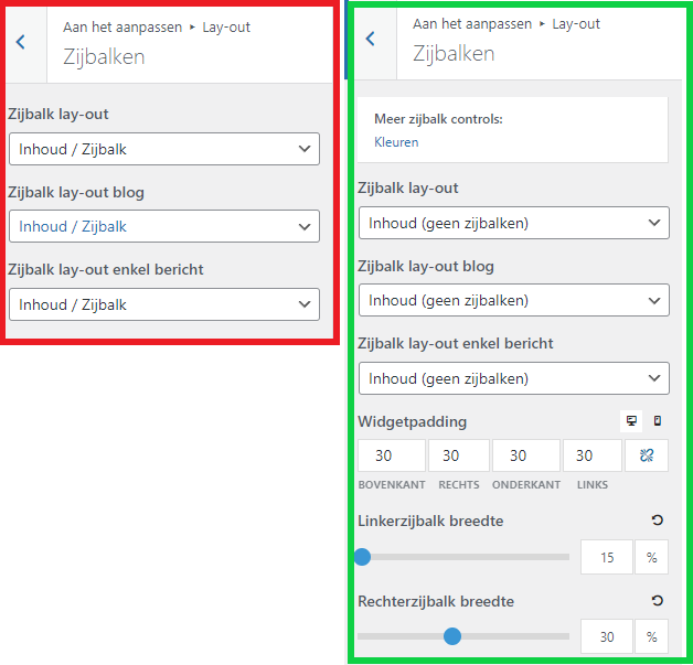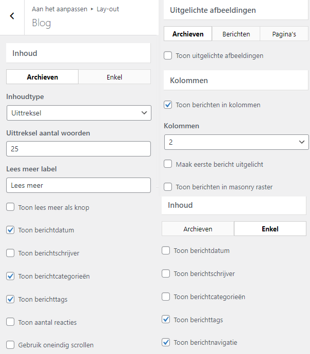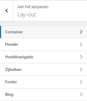 Hier kun je een aantal lay-out instellingen doen voor je blog, footer, zijbalken, hoofdnavigatie, header en de container.