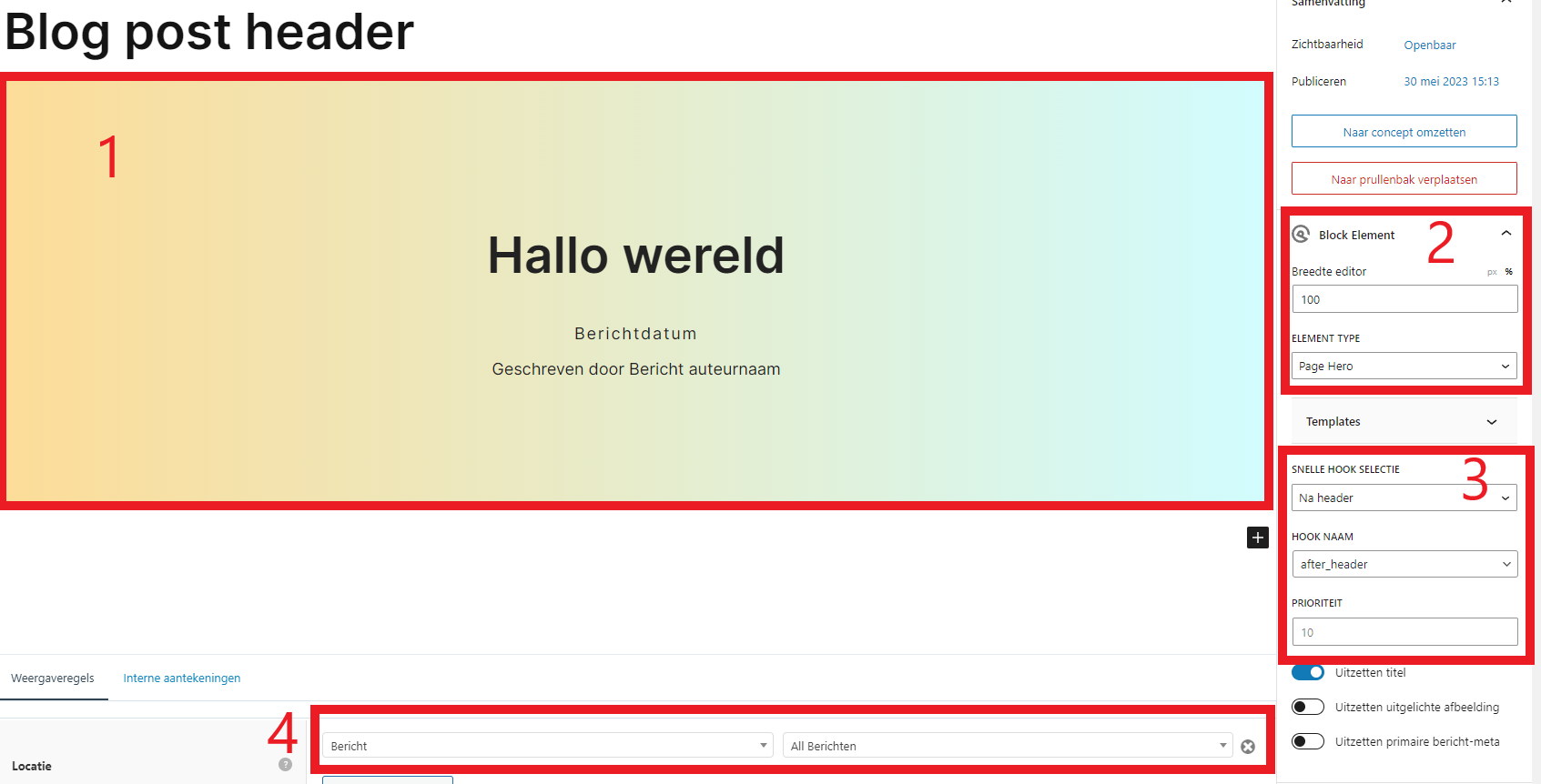 Allereerst is er in de blokeditor (1) het template gemaakt met behulp van blokken. Daarna is bij block element (2) het juiste element type geselecteerd, namelijk page hero. Vervolgens is bij hook naam (3) de juiste plek geselecteerd waar het element geplaatst moet worden. En tenslotte is bij de weergave locatie (4) gekozen om deze header alleen te tonen bij berichten.