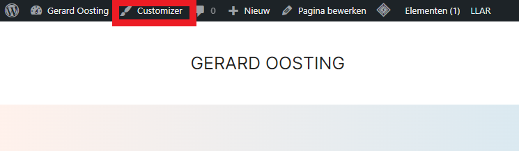 - Manier 2: Als je ingelogd bent zie je in de frontend van je website op iedere pagina een zwarte balk bovenaan je website. Naast de naam van je website vind je hier een knop om de Customizer te openen.