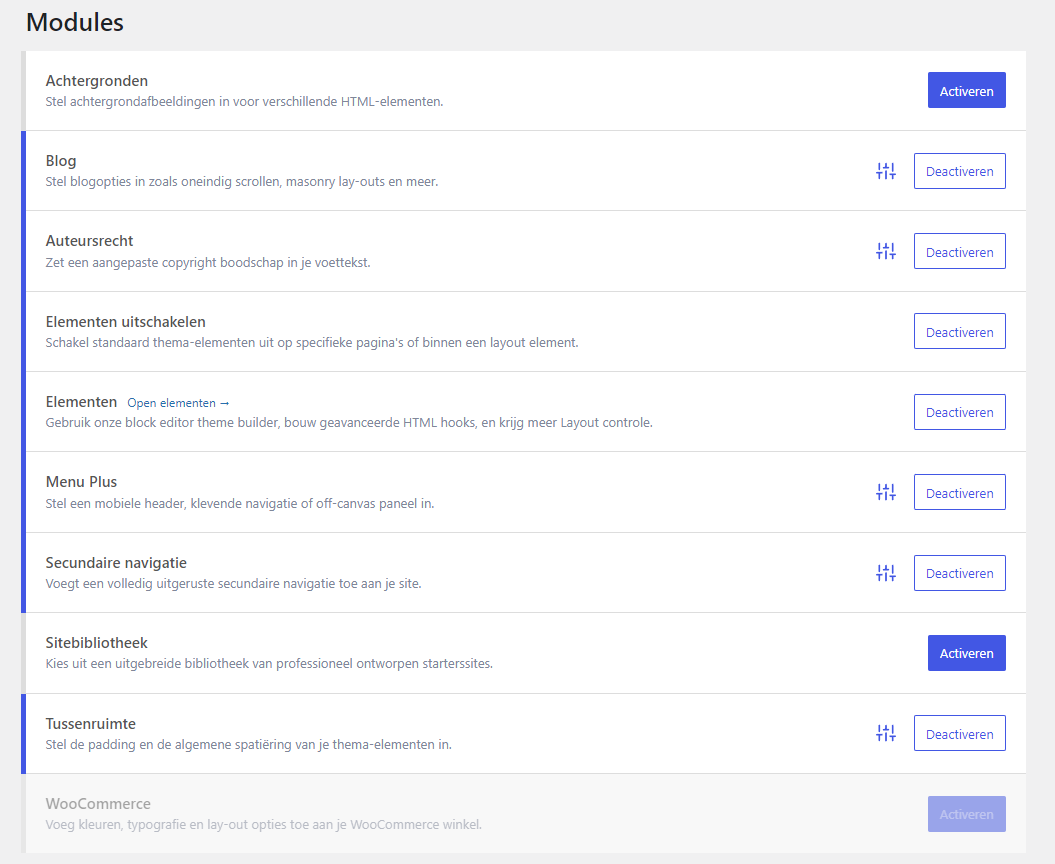 - Modules – in GeneratePress premium kun je de modules activeren die je gebruikt. Zo voorkom je dat je een thema hebt vol functionaliteiten die je nooit nodig hebt.