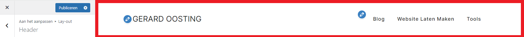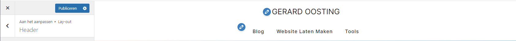 Kies ik bijvoorbeeld voor ‘Navigatie na – gecentreerd’ dan wordt mijn site-titel (Gerard Oosting) in het centrum getoond en daaronder mijn menu items.