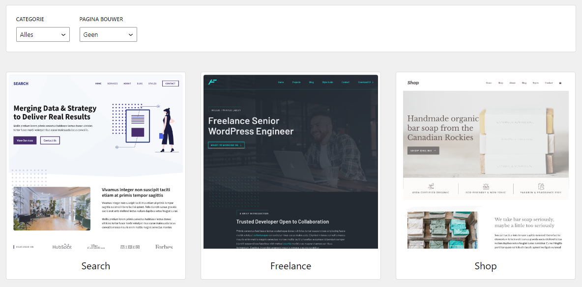 In de site library zijn in totaal 100 templates. Daarvan zijn er 3 die gemaakt met Beaverbuilder en 2 met Elementor. De overige 95 templates maken allen gebruik van de blokeditor.
