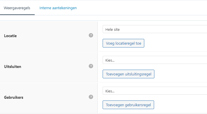 De footer moet op iedere pagina getoond worden, dus de locatie is hierbij de hele site. Het is ook mogelijk om specifieke locaties te kiezen of juist locaties uit te sluiten.