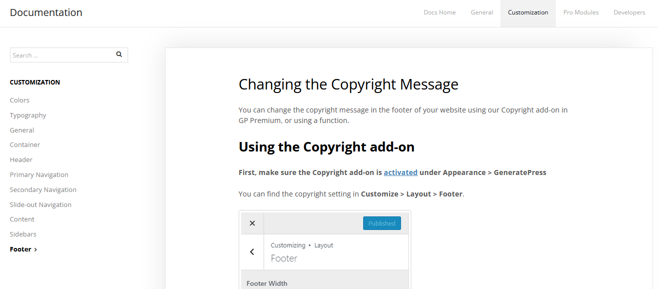 Stel je wilt het copyright bericht onderaan je website aanpassen. Je kunt zelf in de instellingen zoeken waar je dit moet aanpassen of je vindt direct in de documentatie het antwoord op je vraag: