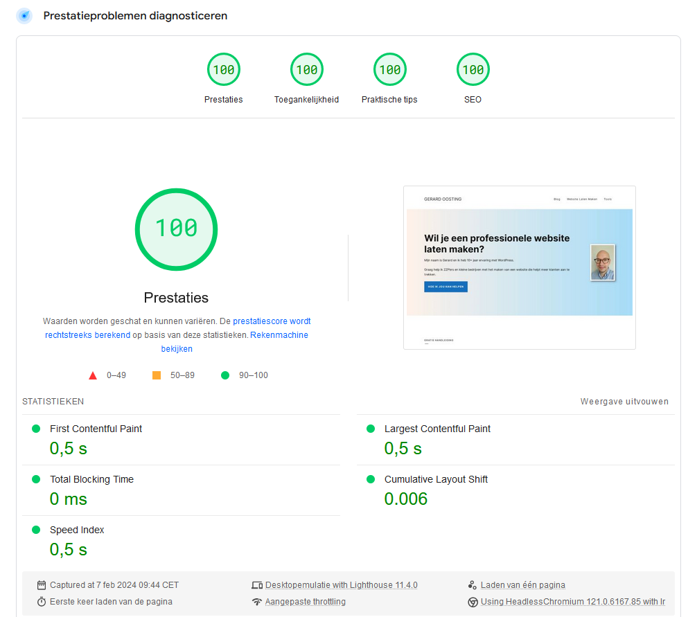 Mijn website maakt gebruik van GeneratePress Premium en heeft zoals je kunt zien goede prestaties. Dit is geen garantie, er zijn namelijk meer factoren die hier invloed op hebben dan alleen het thema dat je gebruikt en je zult niet altijd 100% scores behalen. Mijn ervaring is wel dat het met GeneratePress makkelijk is om goede scores te halen.
