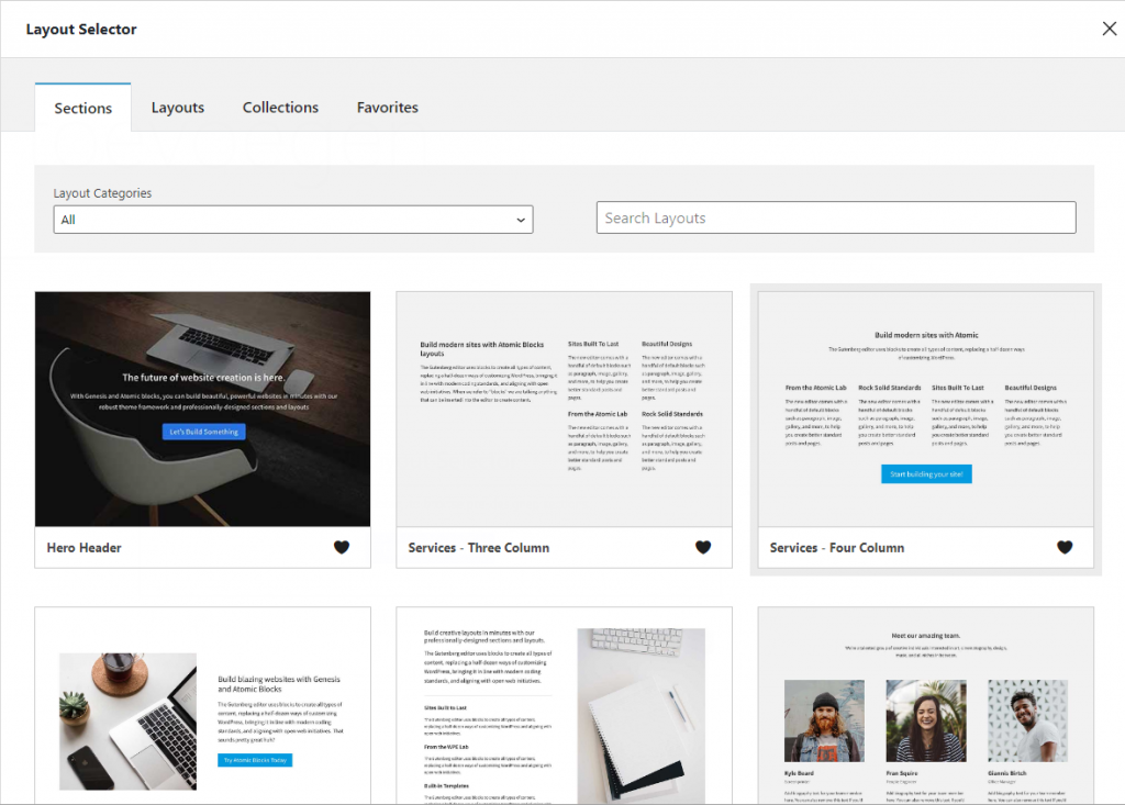 Wil je bijvoorbeeld een pagina met daarop je personeel maken, dan kies je een sectie uit en je pagina krijgt een door hun opgemaakt blok toegevoegd.