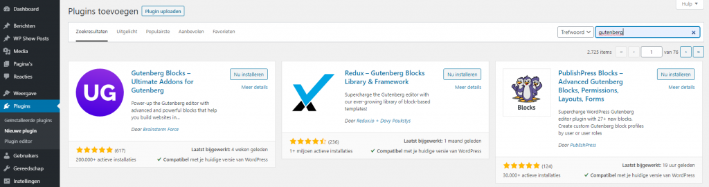 Als je bij ‘nieuwe plugins’ op Gutenberg zoekt vind je genoeg opties.