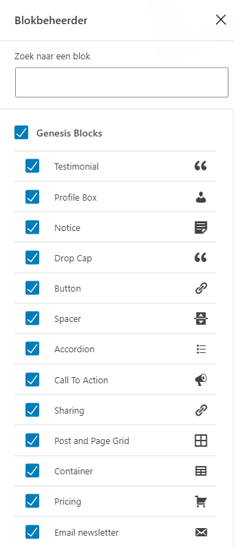 Na het installeren van deze plugin komen er bijvoorbeeld 14 nieuwe blokken bij: