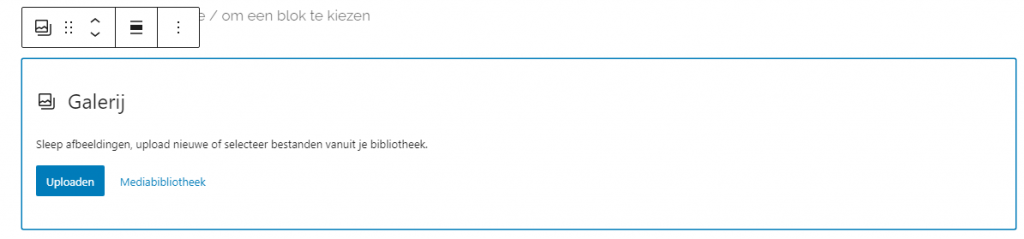 Met het blok afbeelding kan je een afbeelding toevoegen. Om een nieuwe afbeelding up te loaden vanaf je computer klik je op ‘uploaden’. Als je dat al eens eerder heb gedaan kan je de afbeelding opzoeken in de mediabibliotheek.