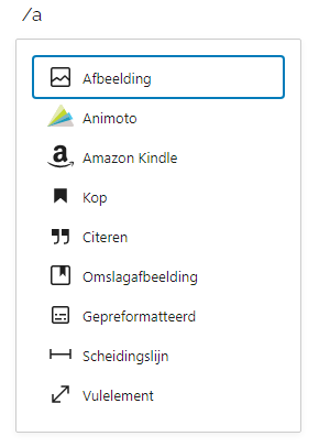 Een andere manier is door / te typen gevolgd door het blok dat je wilt toevoegen.