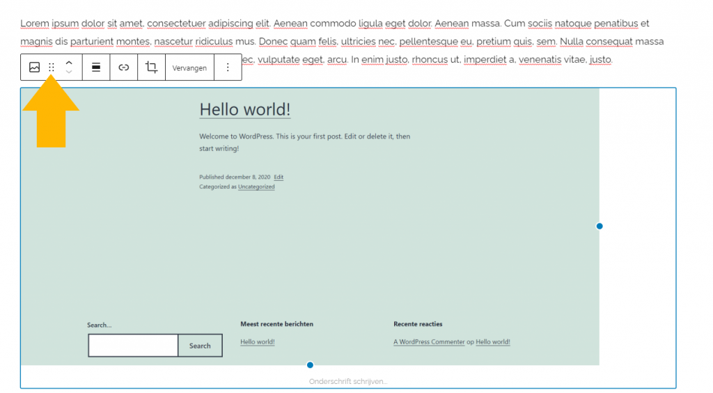 Stel je hebt een pagina gemaakt bestaande uit een blok met tekst (paragraaf) en een blok met een afbeelding. Je besluit dat je een blok tussen het blok met tekst en de blok met de afbeelding wilt plaatsen.