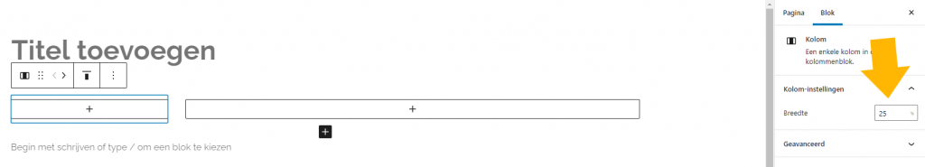 Als je bijvoorbeeld op 50/50 klikt krijg je 2 kolommen. Door op het plusje binnen het kolom te klikken, kan je een blok aan de gemaakte kolom toevoegen: