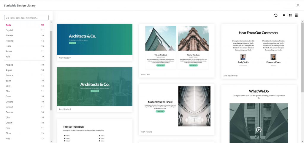 Verder heeft deze plugin een nog uitgebreidere design liberary. Bij de gratis versie heb je keuze uit 89 opgemaakte blokken en bij de premium versie komen daar nog 264 blokken bij.