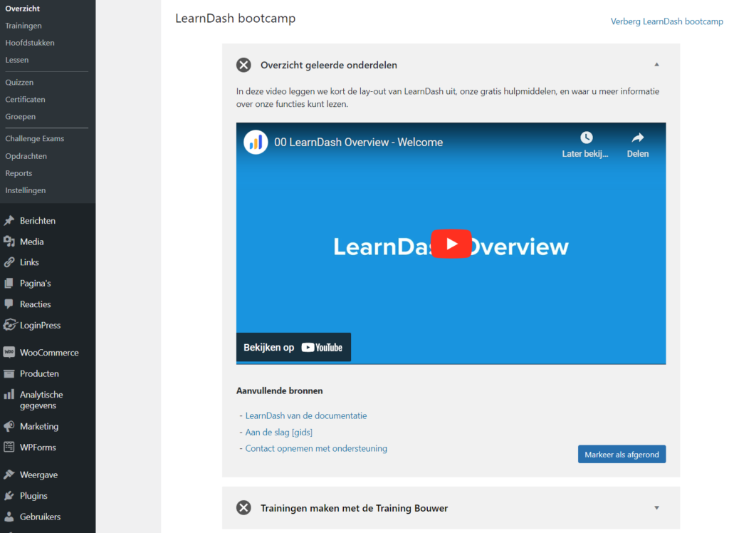 Nadat je de plugin hebt geinstalleerd en geactiveerd krijg je in het overzicht een LearnDash bootcamp te zien. Hier kan je stap voor stap ontdekken hoe de plugin werkt.