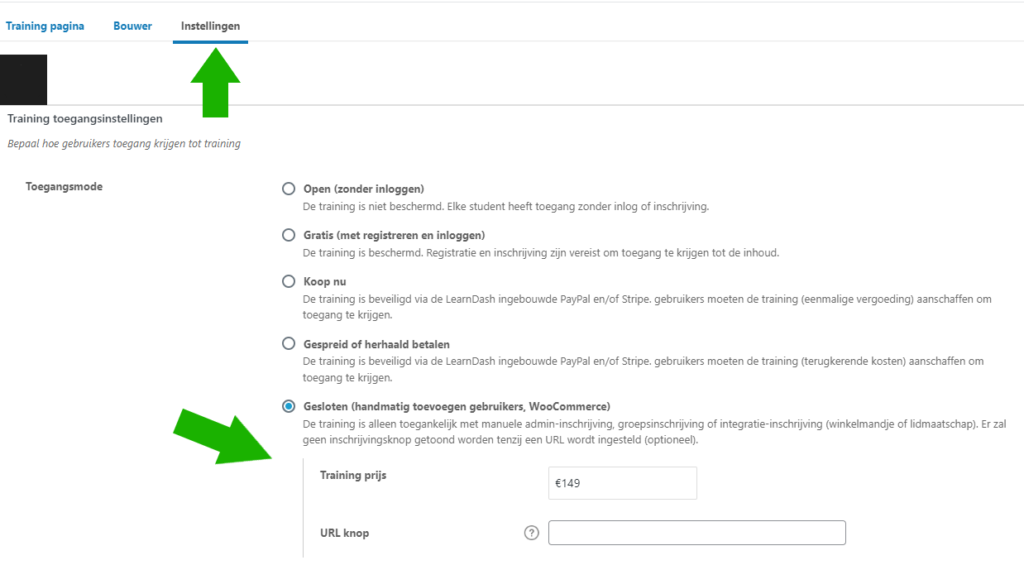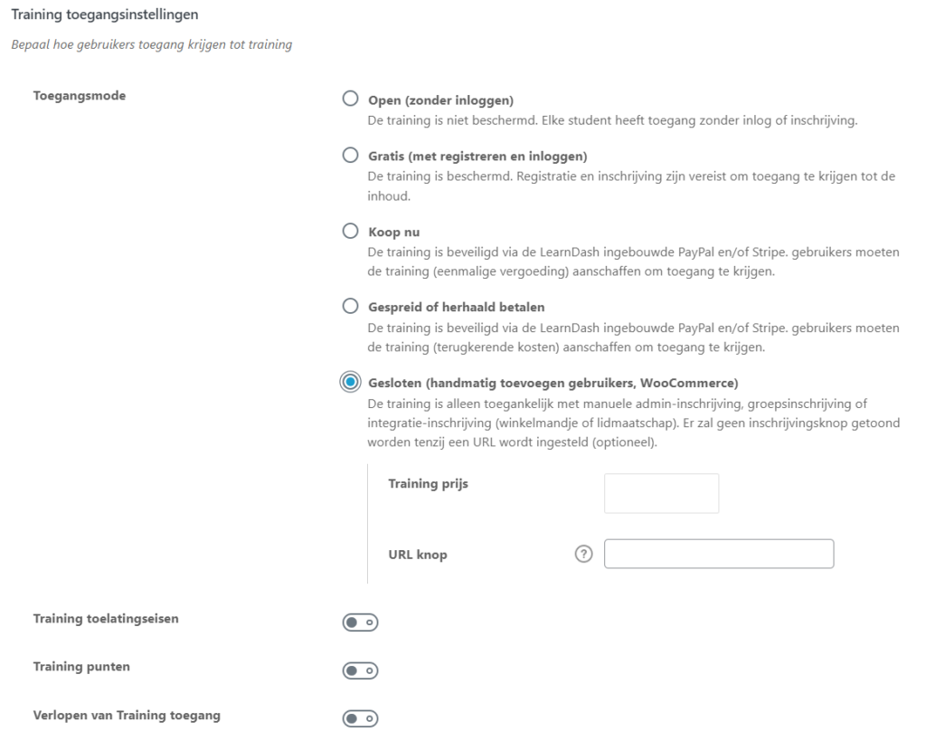 Nadat je het product hebt gepubliceerd kopieer je de URL van de cursus en ga je in het dashboard naar LearnDash LMS > Trainingen en ga je in de gewenste training naar de Instellingen en selecteer je bij Toegangsmode Gesloten (handmatig toevoegen gebruikers, WooCommerce).