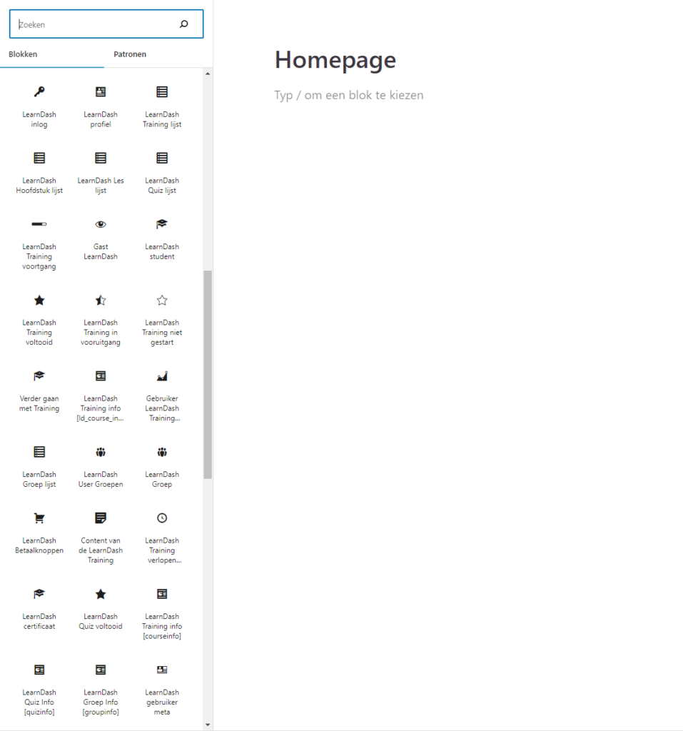Bij het activeren van de LearnDash plugin krijg je in totaal 32 blokken die je kunt gebruiken in de (Gutenberg) blok editor.