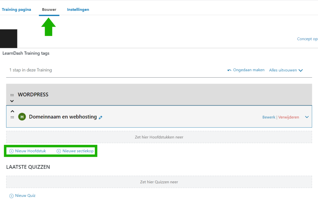 In onderstaand voorbeeld heb ik een Sectie (WordPress) en een hoofdstuk (Domeinnaam en webhosting) toegevoegd: