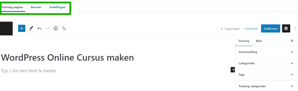 Het verschil met een normale pagina/bericht is dat je bovenaan een aantal tabbladen vindt waarmee je de cursus kunt maken en instellen.
