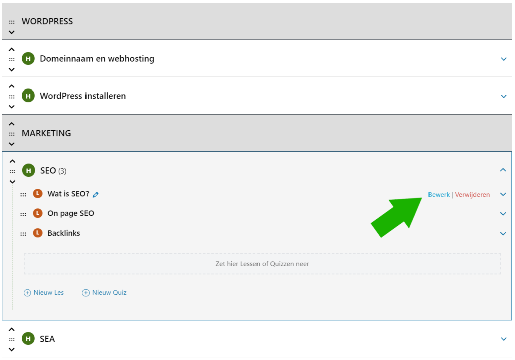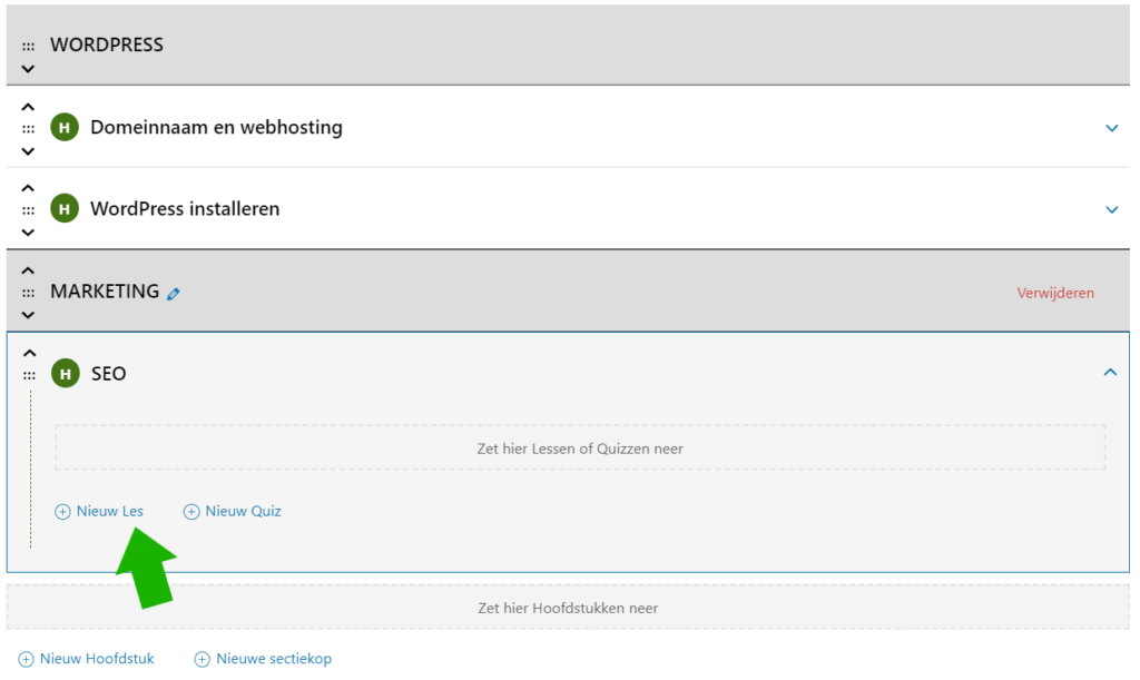 De volgorde van secties, hoofstukken en lessen kun je eenvoudig verslepen.
