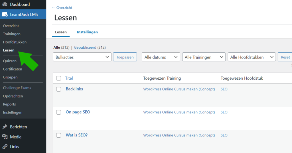 Je ziet vervolgens een overzicht van alle lessen, vergelijkbaar met het overzicht van alle pagina’s en berichten.