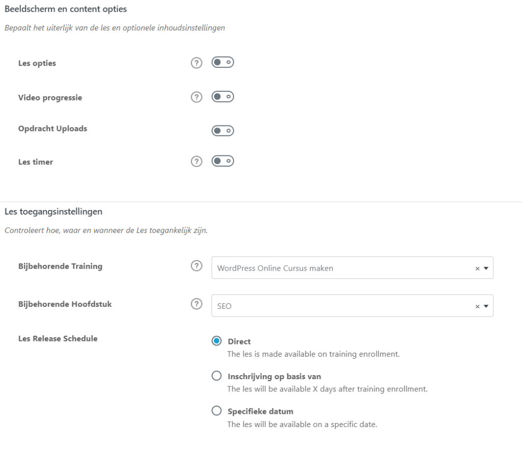 7. Toegangsinstellingen – Je kunt per les instellen of de inhoud direct zichtbaar is of pas na een x aantal dagen. Hiermee kun je er bijvoorbeeld voor zorgen dat cursisten niet alle content in 1x volgen. Dit zorgt ervoor dat cursisten terug blijven keren naar je cursus. Een bijkomend voordeel is dat cursisten vaak de content beter opnemen als ze niet alles zo snel mogelijk proberen te volgen.