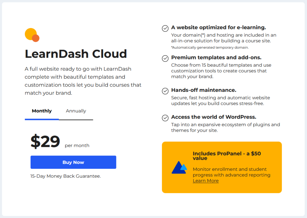 LearnDash Cloud betaal je altijd voor 1 prijs waarbij je kunt kiezen tussen $29 per maand of $299 per jaar.