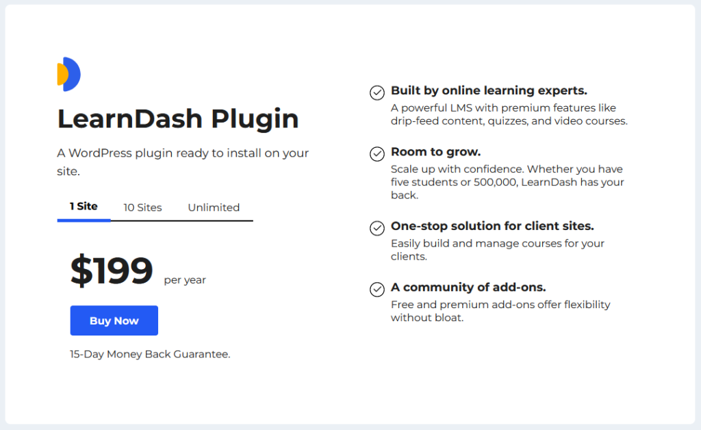 LearnDash heeft geen gratis plugin en helaas ook geen gratis proefperiode om de plugin uit te proberen. Ze bieden echter wel een 15 dagen geld terug garantie aan.