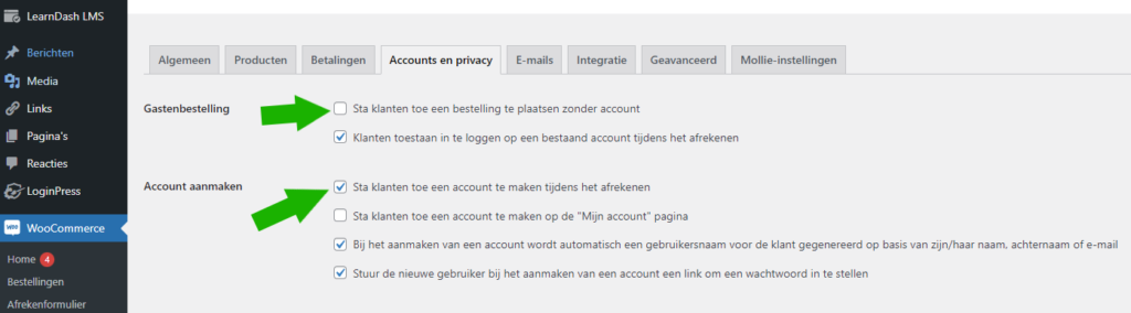 Je wilt dat iemand na het afrekenen een account aanmaakt waarmee diegene toegang heeft tot de online cursus die je verkoopt. Je moet hiervoor in het dashboard bij WooCommerce > Accounts en privacy en in ieder geval de volgende instellingen hebben gedaan: