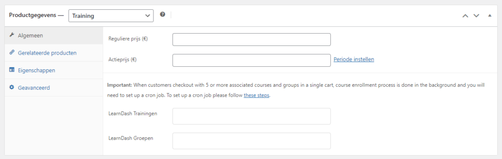 Je stelt hier vervolgens de prijs in en selecteert bij LearnDash Trainingen de cursus uit de lijst die je wilt verkopen.