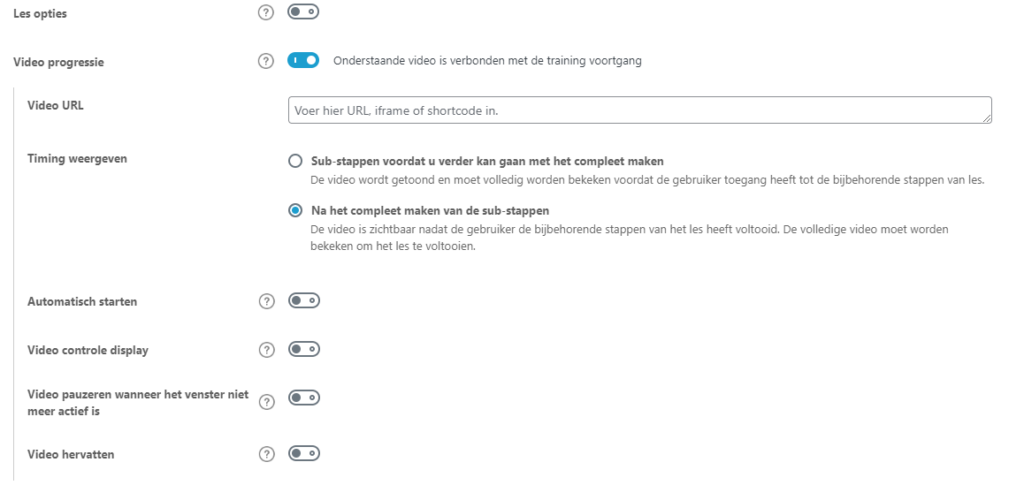 Een goed voorbeeld van de gebruiksvriendelijkheid is de manier waarop je de video progressie kunt instellen. Dit doe je in het tabblad Lesinstellingen van een bepaalde les waarin je een video wilt uploaden Je kunt video’s zelf hosten of hosten op diensten als Youtube of Vimeo (dit is mijn advies). Je plakt de link van de video vervolgens en kunt allerlei handige dingen instellen: