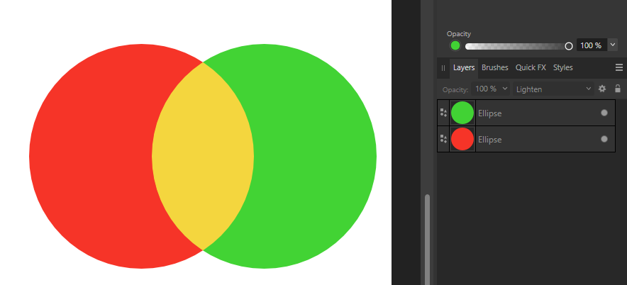 In onderstaand voorbeeld zie je hoe ik een rode cirkel laat overlappen met een groene cirkel, waarbij de kleuren zijn ingesteld op doorzichtigheid zodat je het effect van kleuren mengen kunt zien: