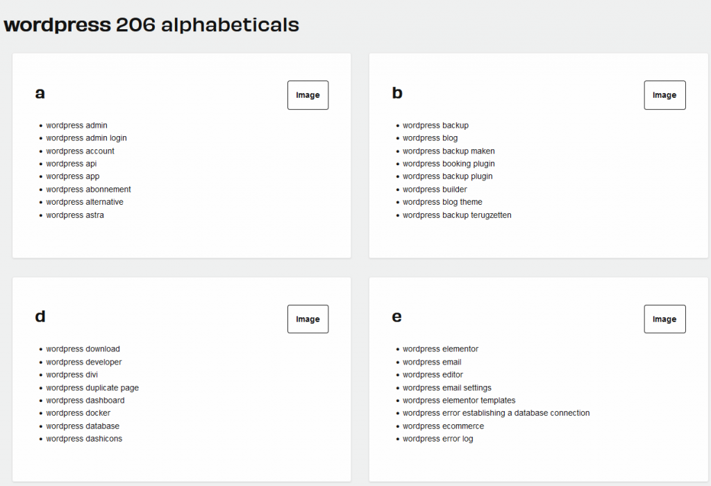 Probeer dus zoekwoorden te groeperen in onderwerpen door logisch na te denken en indien nodig naar zoekvolume te kijken.